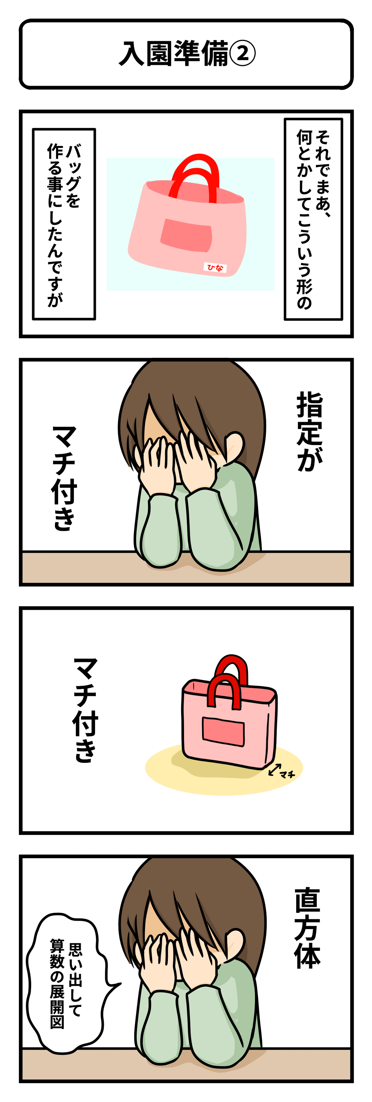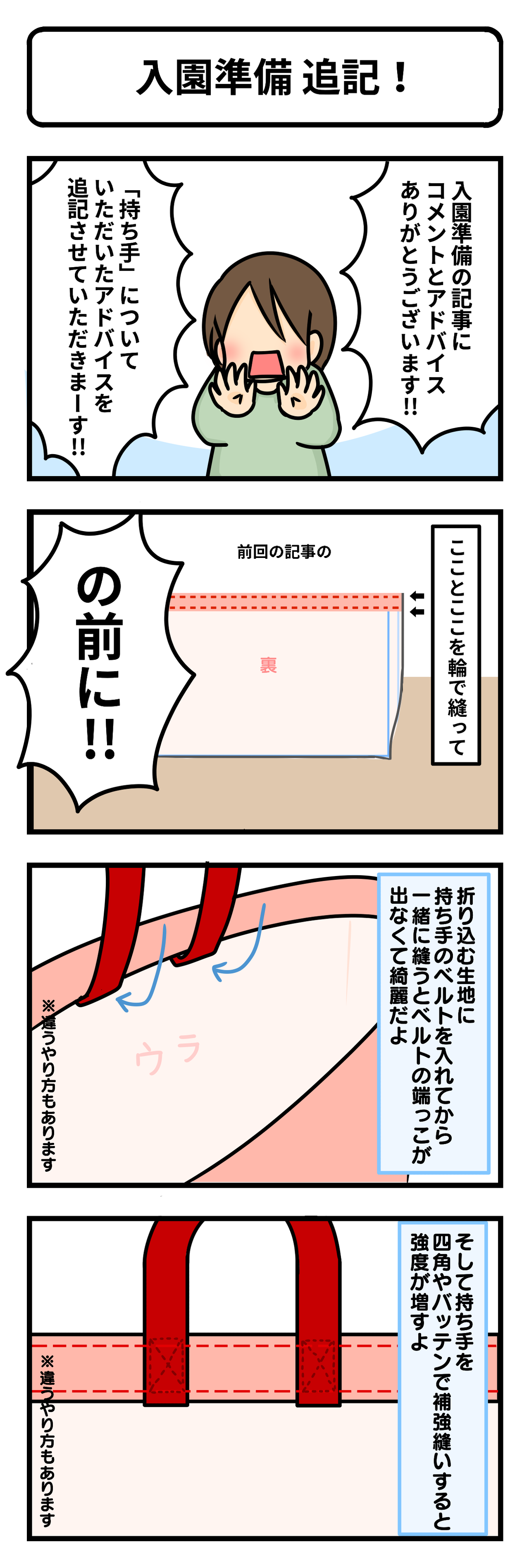 2018年02月11日 入園準備④ カテゴリ : ひな3歳〜 入園準備①入園準備②入園準備③からの続きです! 入園バッグの作り方についてたくさんのアドバイスありがとうございます!! おかげさまで「マチ」を作れるようになりました(≧▽≦) また前回の記事で付いていなかった「持ち手」についてもアドバイスをいただきあ