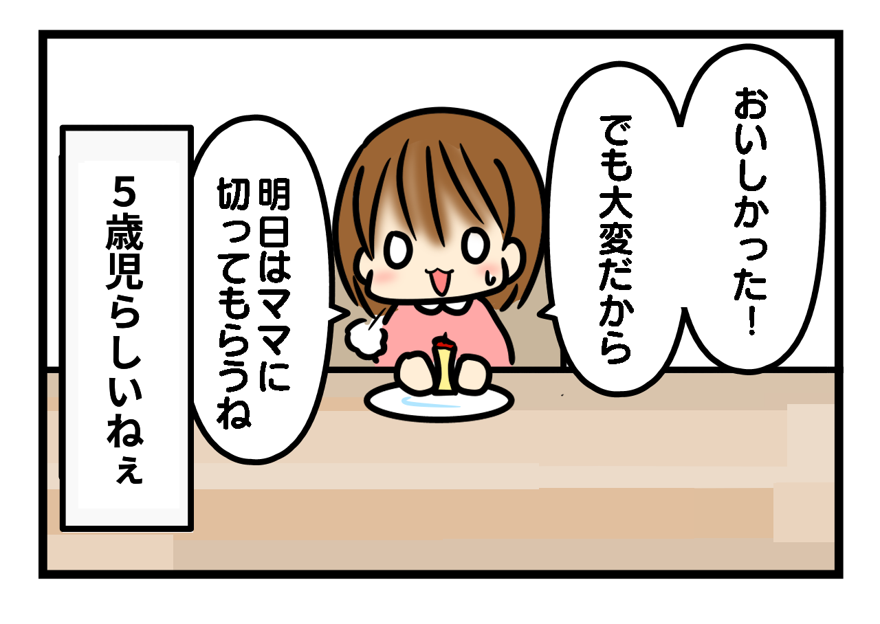 5歳じゃまだ口も小さいし、林檎って一個丸々だと結構お腹にたまる(経験者談)のに、ちゃんと食べきってるのはすごいと思います。