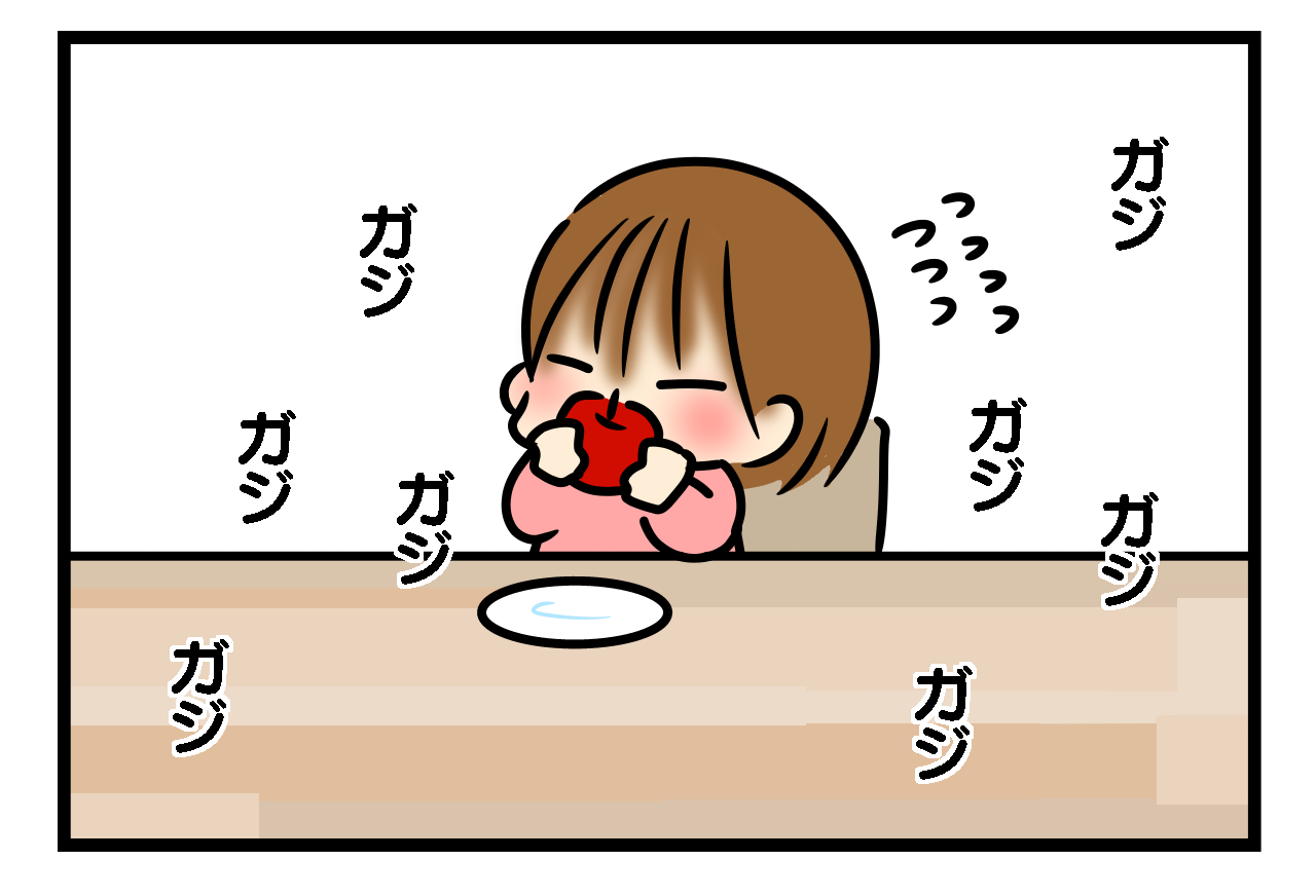 うちの子、一歳過ぎに祖父がおもちゃ代わりに渡したりんごをいつの間にか「しゃくしゃく」と食べてました。歯が生えるのがゆっくりめで前歯4本がようやく揃った頃です。気に入って必死に食べてる様が可愛かったですが、「マジか...」という思いのが強かった(笑)