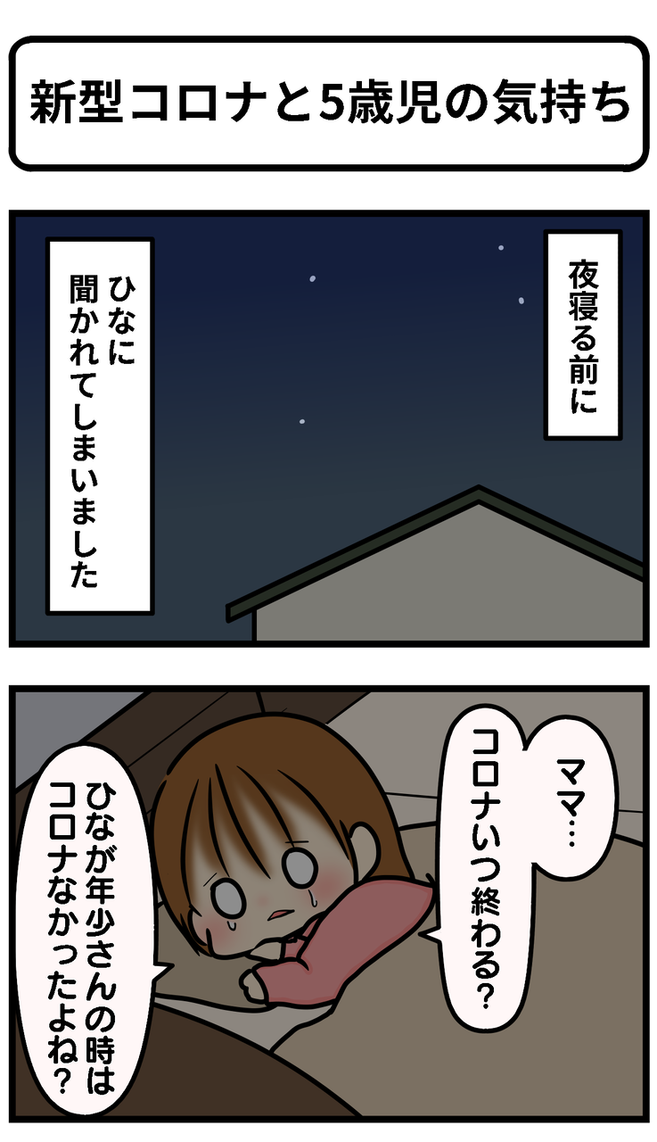 私の娘も5才でこのお話しを見て、胸が痛みました。私の娘も夜泣きが始まったり、ニュースはコロナばかりで見たくないと泣き、保育園はお友達が少なくてさみしいと泣くばかりです、今は心を穏やかに過ごすように頑張っています。ちなみに我が家ではやりたいことノートを娘と作りました!コロナが落ちついたら何をしたいかノートに書いてリストをつくり楽しい未来を想像してます☆