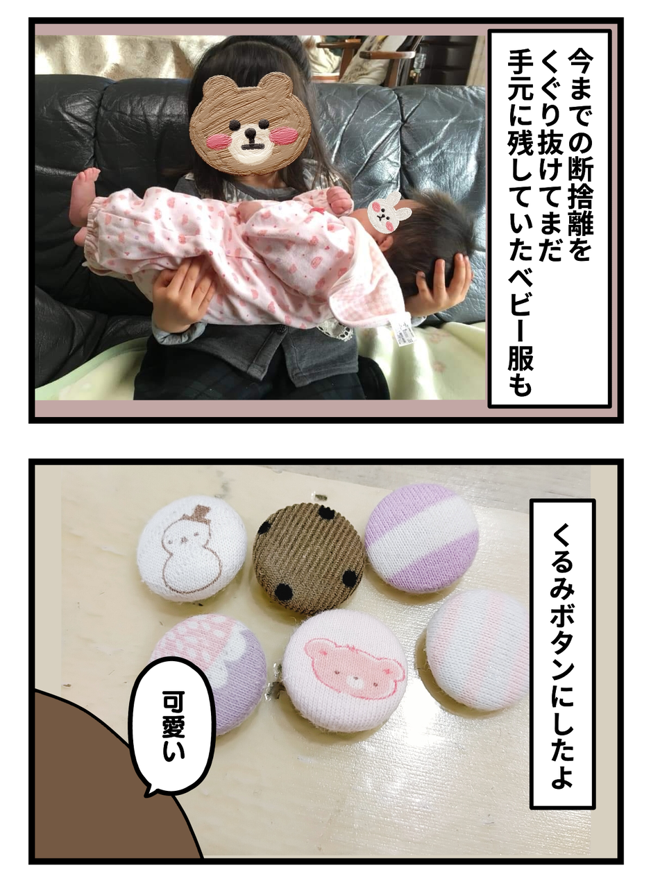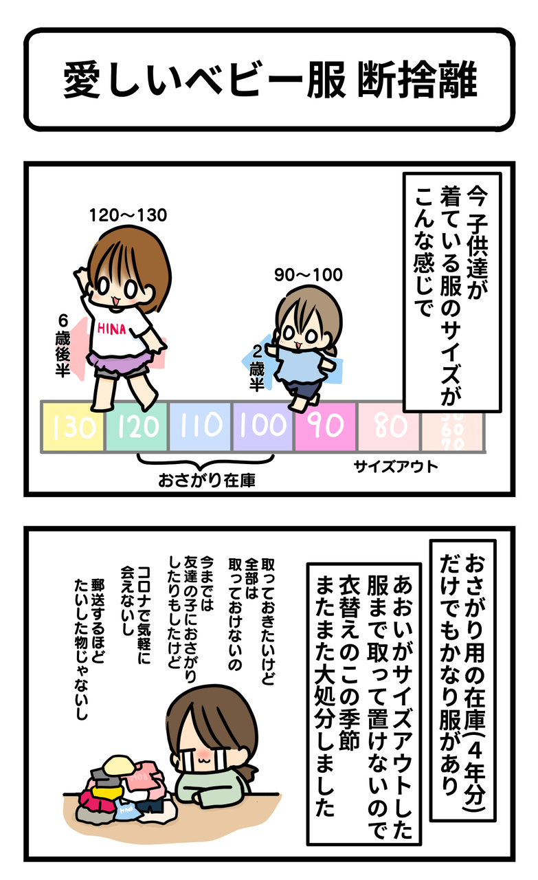 でも小学校4・5年あたりで赤ちゃんの頃の写真や洋服などを持っていく課題が出るので、少しだけベビー服残しておいた方がいいですよ!出来れば一番お気に入りのものとは別に、万が一汚れたりしても悲しくないものも(^_^;)