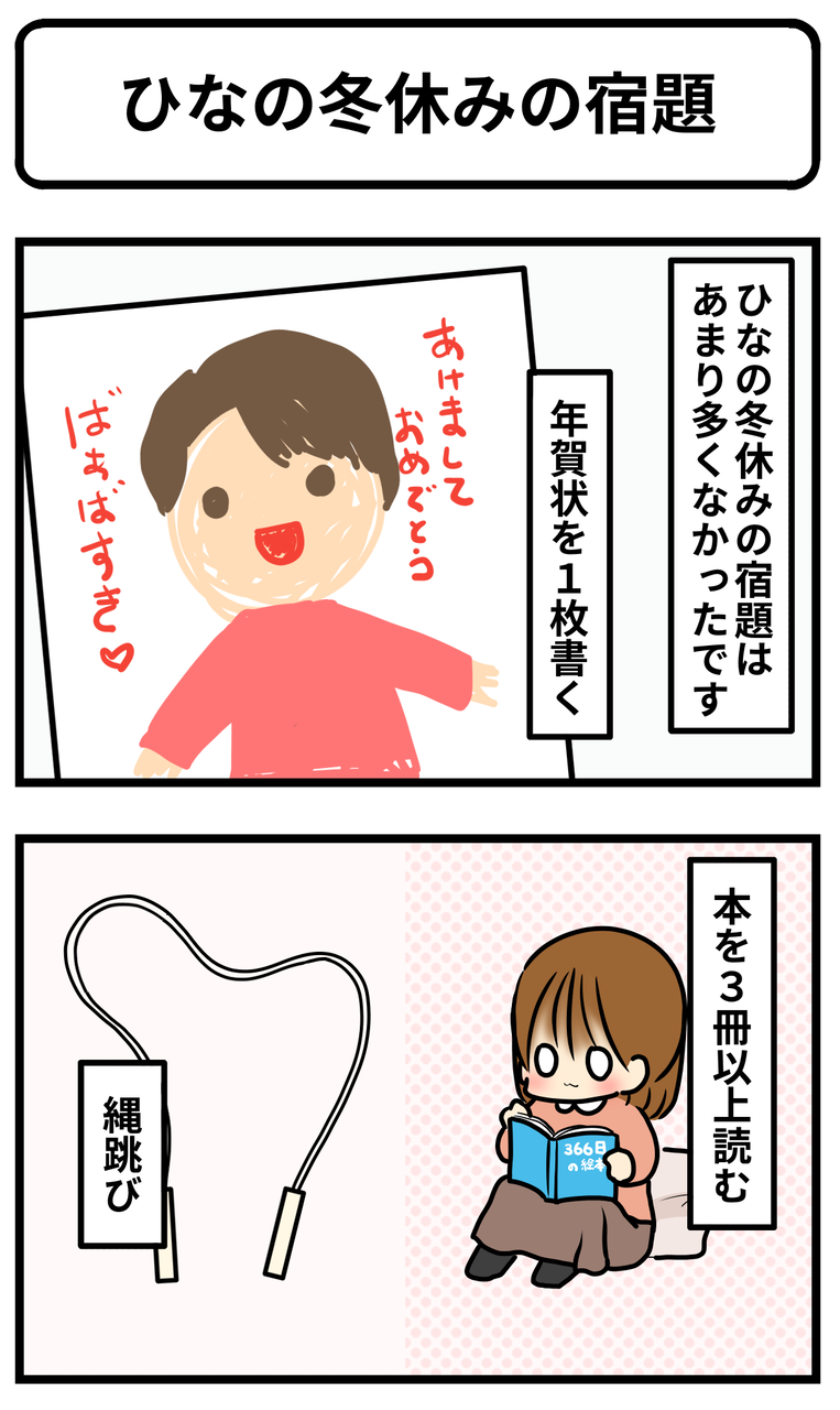 うちはワーク1冊、書き初め(硬筆)、計算カード、お手伝い、縄跳び、絵日記、本読みでした。