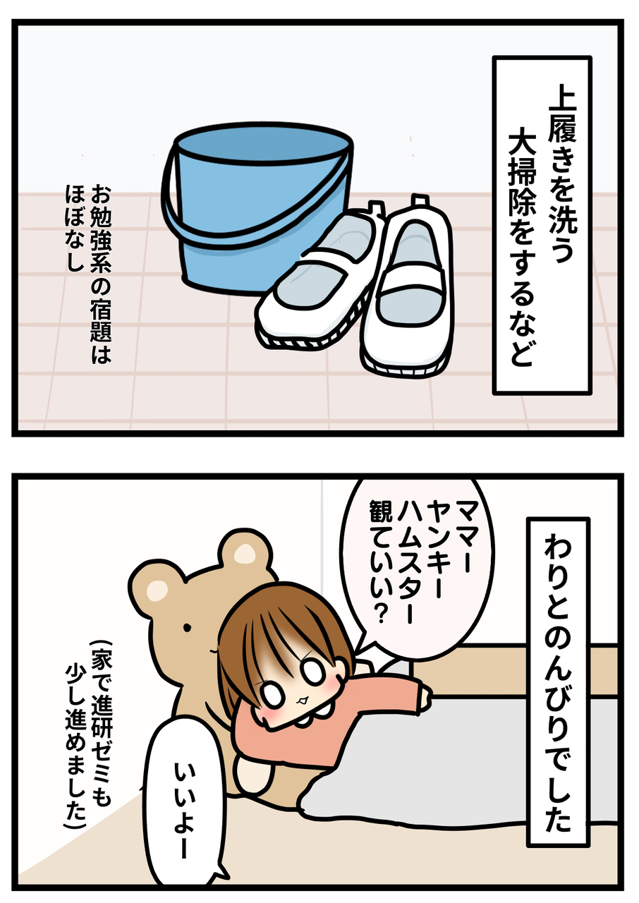 ワークは早く終わらせてたけど、毎日やるものがいくつかあり、それが終わらないとゲームが出来ない約束を作って(ほぼ守られない約束でしたが…)まぁ、風邪も引かずに過ごせたので良かったです。