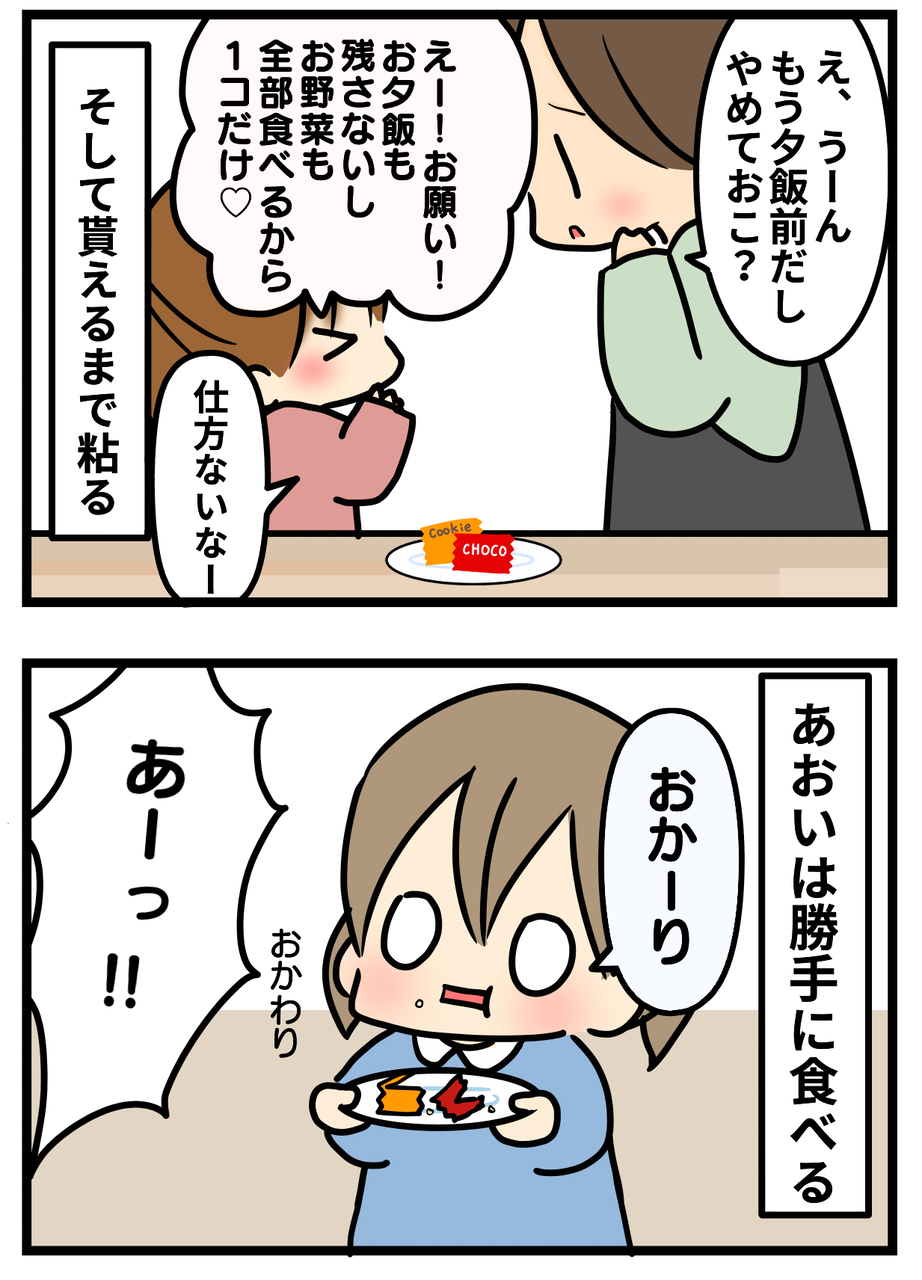 6歳の娘は聞いてくるけど、2歳の息子はソファーの裏に持って行ってこっそり食べます(笑)