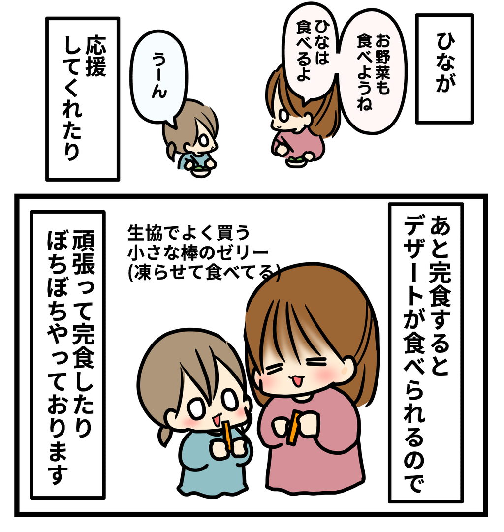 とか言うと食べさせながらだけど完食してくれる時もあります。