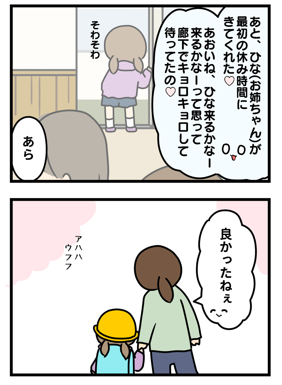 あと学校🏫で休み時間にひなちゃんが来るかもとワクワク😃💕しているあおいちゃん、おそらくクラスメートから「お姉ちゃん、あおいちゃんのこと好きだね」と思われているのかな?ひなちゃんのクラスメートはほぼ全員が「妹ちゃんのこと好きだね」と思っているでしょうからそのうち何人かで来て盛り上がっているかも?これから先楽しい学校生活になるといいですね。