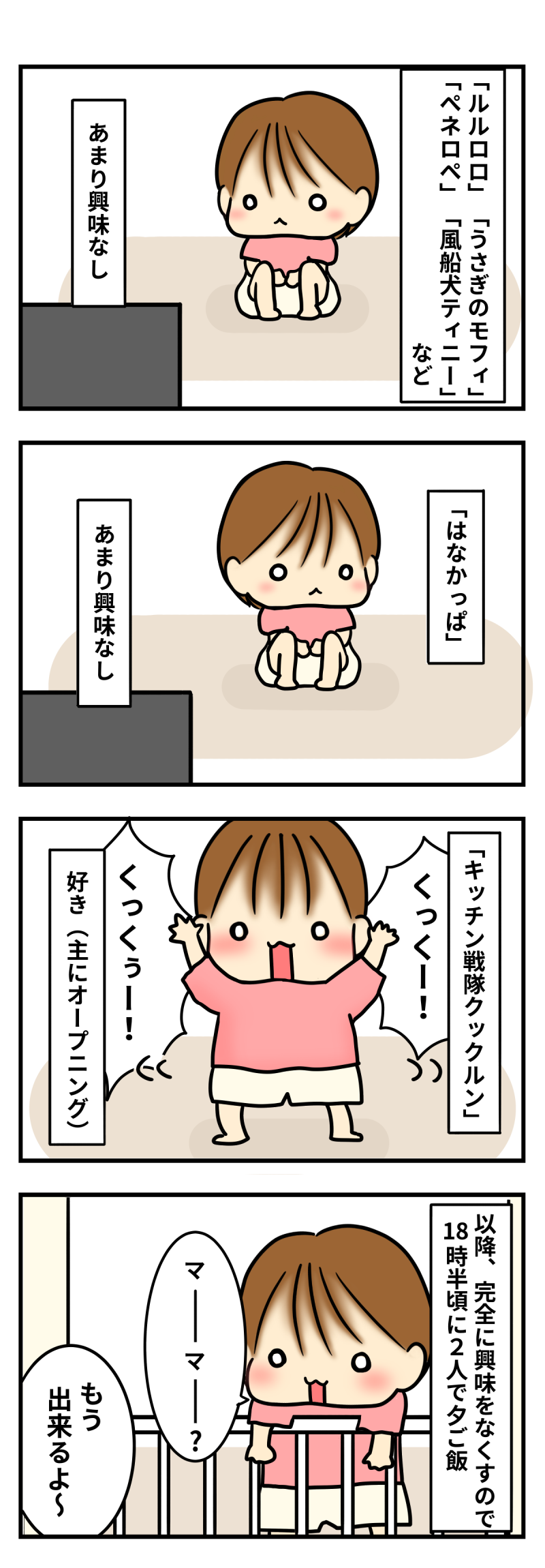 今4歳年中ですが、朝7時からのシャキーンに始まり、えいごであそぼまで、しっかり観るようになり、夕方のクックルンも今は観るようになりました。
