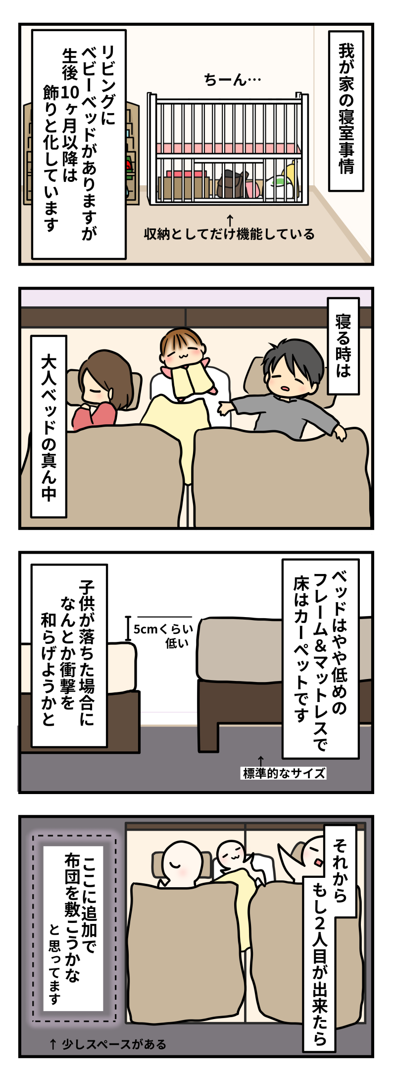 うちはまさに!!今日の4コマのストーリーでした☆ベッドには誰も寝てないのに無駄に幅とってます!そして3人目が産まれるのでまた悩む予定です(;•̀ω•́)これからも更新、楽しみにしてます!