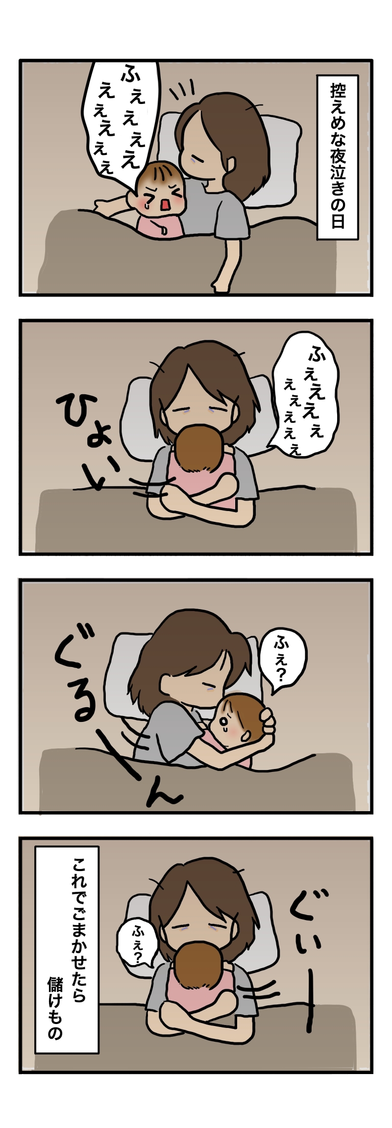 今、娘は寝ててベッドから落ちて、泣いても、サッと抱き上げて、トントンしたら、またすぐ寝るくらい、図太くなりました(笑)