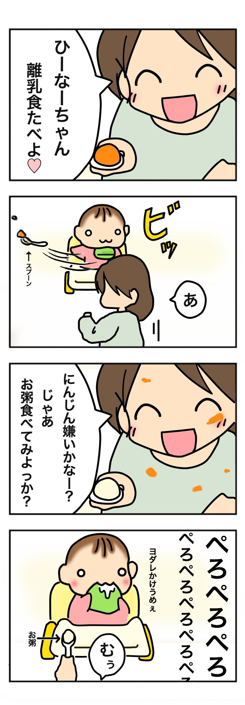 離乳食苦戦してます……全く食べないわけじゃないんですが、いつも嫌そうな顔されてしまって orz