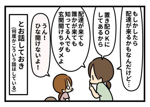 2023年06月16日 留守番中のお届けもの(後編) カテゴリ : ひな8歳〜ママ ※ひな8歳 あおい4歳※追記 漫画内のタイトル修正しました!防犯大事だけど(ノノ)(ひなにはちゃんと話したよ)佐川さんもヤマトさんもなんとなく「いつもの人」みたいな人がいて大変お世話になっております。佐川さんは以前ひなと間違えて危うく「おかえりプリティプリン